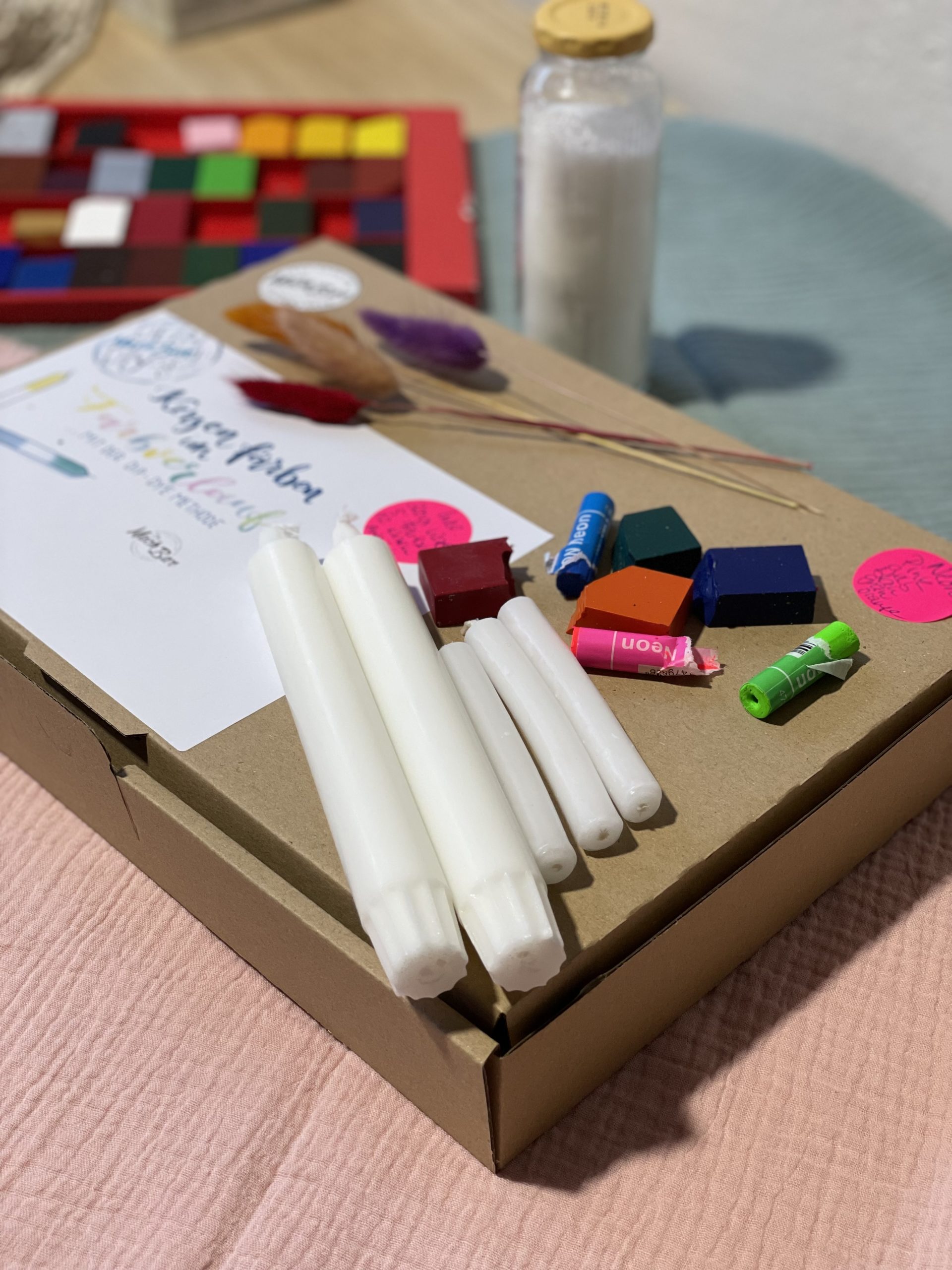 5 verschiedene Farben je Set (hochpigmentierte Wachsfarben, mit denen ihr wirklich lange auskommt und sicher eine zweite, dritte, vierte… Diprunde machen könnt)