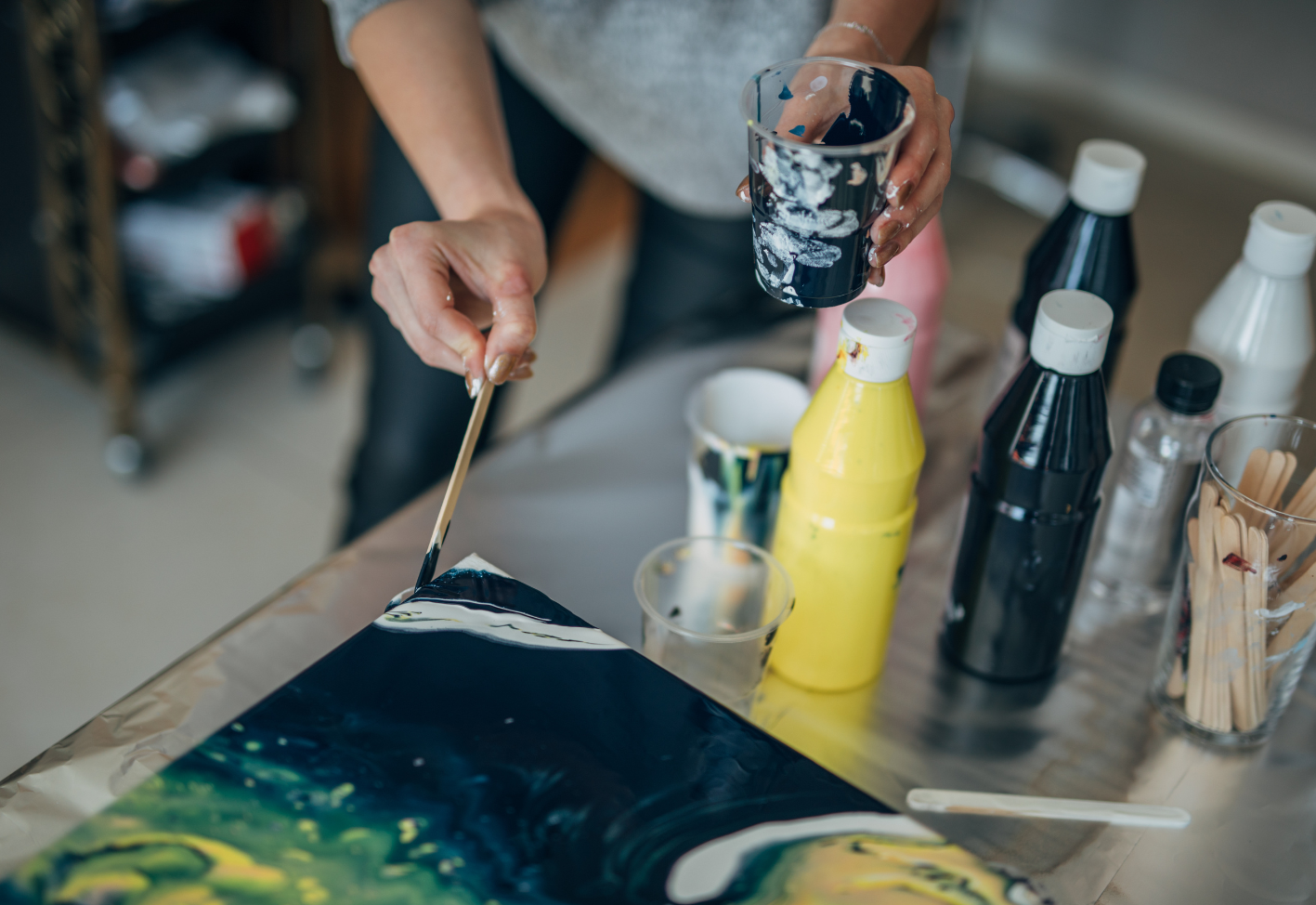 Das wirklich Tolle ist: du musst keine Erfahrung mit Acrylfarben oder Malen an sich haben. Hier kannst du innerhalb von zwei Stunden einfach dem Rausch der Farben und tollen Effekte und deiner Intuition folgen. Nebenbei wirst du völlig vom Alltag abschalten!