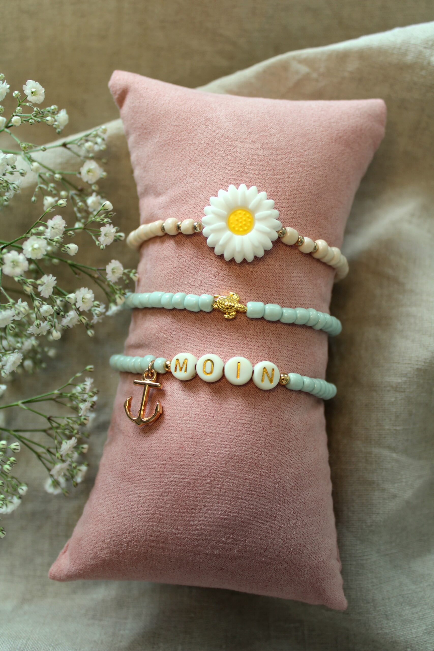 – große Auswahl an Perlen und Anhänger, die auf Elastikband gefädelt werden (alles nickelfrei)